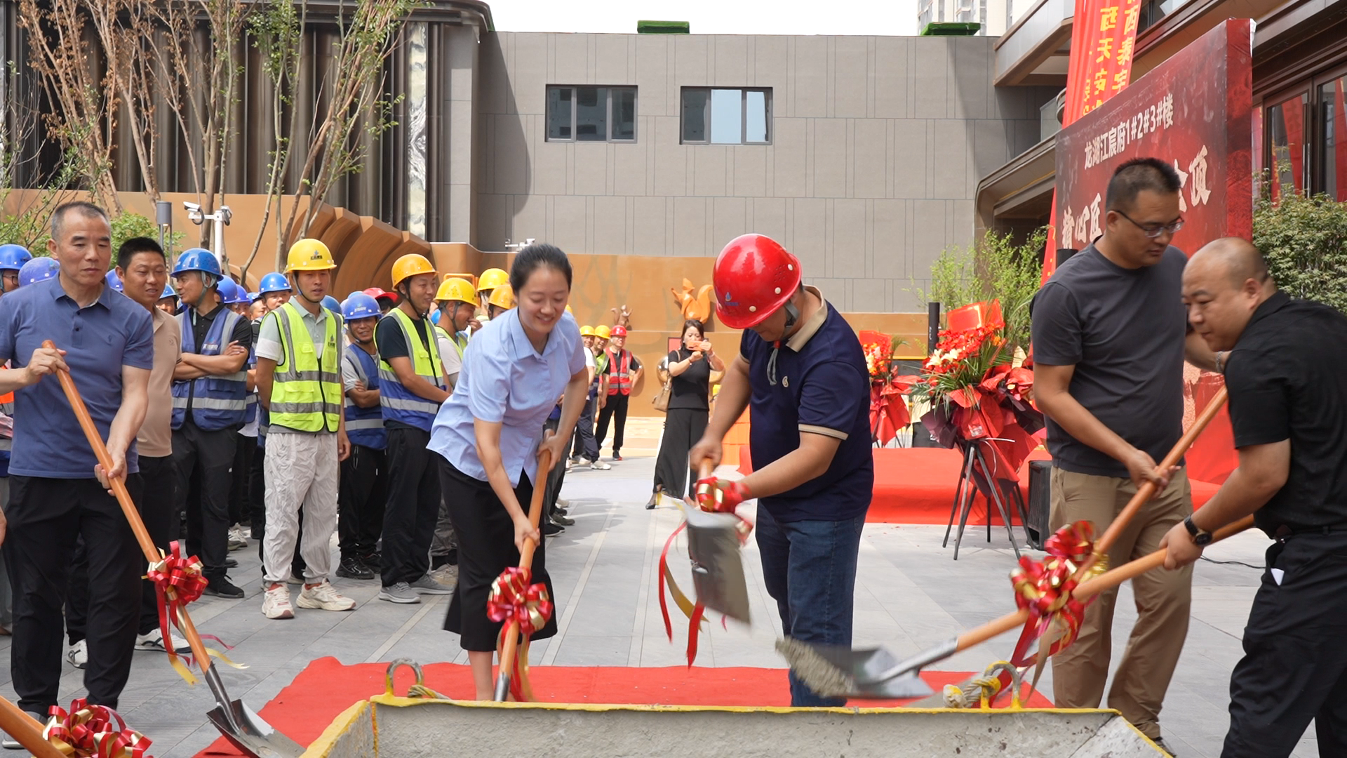 10時(shí)許,各方嘉賓和代表歡聚一堂,封頂儀式在熱烈的掌聲中拉開序幕。首先,鳴炮志喜。隨著禮炮轟鳴、彩煙升空,現(xiàn)場(chǎng)氣氛一下子被點(diǎn)燃了,大家都期待著見證和分享這一榮耀時(shí)刻。接著,各方代表致辭祝賀。代建單位、施工單位、監(jiān)理單位等紛紛發(fā)言,表達(dá)了對(duì)項(xiàng)目建設(shè)主體工程即將封頂?shù)淖YR和對(duì)各方大力支持的感謝,贊揚(yáng)項(xiàng)目建設(shè)團(tuán)隊(duì)“保質(zhì)量、爭(zhēng)效率、趕速度”的拼搏精神。大家一致認(rèn)為,龍湖·江宸府住宅小區(qū)項(xiàng)目設(shè)計(jì)超前、布局合理、精心匠筑,不僅是建設(shè)團(tuán)隊(duì)傾力打造的重點(diǎn)工程,更是融入城市發(fā)展、服務(wù)地方經(jīng)濟(jì)的又一力作。從藍(lán)圖規(guī)劃到破土動(dòng)工,從基礎(chǔ)澆筑到主體節(jié)節(jié)攀升,300多個(gè)日夜的奮斗與堅(jiān)守,凝結(jié)了無數(shù)建設(shè)者的智慧、心血和汗水。最后,隨著各方代表共同執(zhí)起象征性的金鏟,完成最后一鏟混凝土的澆筑,龍湖·江宸府1#、2#、3#樓主體結(jié)構(gòu)正式宣告封頂。這不僅是一個(gè)工程節(jié)點(diǎn)的完成,更標(biāo)志著這座占據(jù)城市核心發(fā)展動(dòng)脈、重塑奧體天際線的封面地標(biāo),正從藍(lán)圖加速走向現(xiàn)實(shí),這如同一座豐碑,鐫刻著所有建設(shè)者的榮光與驕傲。
